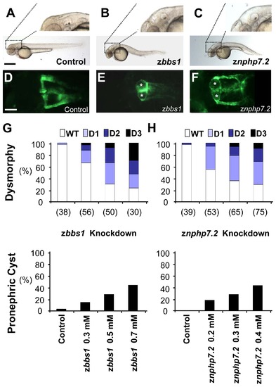 Depletion of zBbs1 and zNphp7.2 causes dose-dependent hydrocephalus and pronephric cysts. Zebrafish embryos injected with MOs at the 1-cell stage were evaluated for their phenotype at 55 hpf. (A) Control zebrafish embryo with magnified normal brain area. Scale bar = 500 μm. (B and C) zbbs1 AUG MO-injected embryo and znphp7.2 SP1 MO-injected embryo with hydrocephalus. (D) The Tg(WT1b:EGFP) transgenic line shows normal pronephric glomerulus and tubules (Scale bar = 100 μm), (E and F) zbbs1 AUG MO-injected embryo and znphp7.2 SP1 MO-injected embryo show pronephric cysts (asterisks). At 55 hpf, larval dysmorphy was categorized according to the visual scale (Fig. S3). The degree of dysmorphy was increased with the amount of injected MOs (G, zbbs1 AUG MO; H, znphp7.2 SP1 MO). (G and H) Cystic pronephric phenotypes were dose-dependent in zebrafish embryos injected with zbbs1 and znphp7.2 MO respectively. The graphs show percentages of the number (n) of embryos that were examined. |