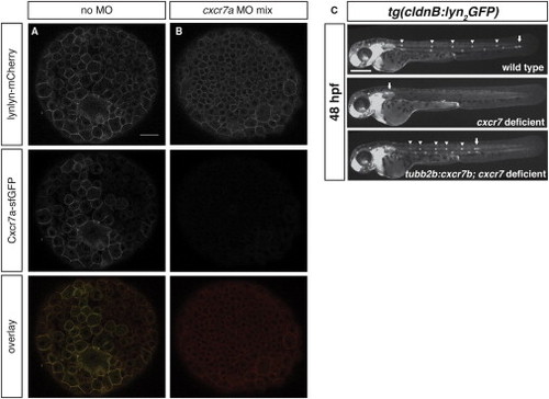 Characterization of cxcr7a Morpholino Mix and Rescue of Primordium Migration in cxcr7-Deficient Embryos Expressing cxcr7b in the Posterior Lateral Line Nerve, Related to Figures 1 and 4 (A and B) Confocal sections through embryos injected with an mRNA mix coding for cxcr7a-sfGFP and lyn2-mCherry without (A) or with translation blocking cxcr7a morpholinos A and B (B). Scale bar, 30 μm. (C) Position of primordia in representative embryos of the indicated genotypes. Scale bar 300 μm. |