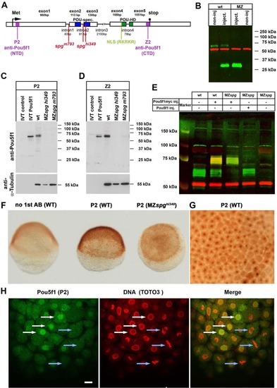 Expression of Pou5f1 specific protein during early zebrafish embryo development. A: Schematic representation showing translation start (arrow) and stop codon, location of POU-specific (blue) and POU homeo-domains (green), and a putative nuclear localization site (NLS) based on sequence comparison to the mammalian Oct4 NLS (Pan et al., 2004) is also indicated (light green). Sequence used to produce Pou5f1 specific P2 and Z2 (purple) antibodies. Positions of the point mutation in spgm793 (Belting et al., 2011) and the insertion site in spghi349 mutants (Burgess et al., 2002) are indicated. B: Fluorescent Western blot analysis using Pou5f1 (P2, green) and α-tubulin (red) antibodies with extracts of 70% epiboly stage wild-type (WT) and MZspg whole embryo extracts. Embryos for samples labeled “inject” were injected with mRNA encoding the truncated spgm793 mutant form of Pou5f1. Endogenous Pou5f1 protein (green) was detected only in WT around 60 kDa. The overexpressed mutant truncated form of Pou5f1 was detected around 30 kDa only in mRNA injected embryos, but not in noninjected MZspg embryos, indicating that no detectable amounts of the truncated form accumulate in MZspg embryos. C,D: Western blot analysis using anti-Pou5f1 P2 (C) or Z2 (D) antibodies shows in vitro translated Pou5f1 as a single protein band at around 60 kDa, while in WT embryo extracts multiple bands are detected within a close molecular mass range similar to the in vitro transcribed protein. Pou5f1 signal was detected neither in MZspgm793 nor in MZspghi349 mutant embryos. anti-α-tubulin was used as loading control after stripping and re-blocking. E: Fluorescent Western blot analysis of extracts from WT and MZspg whole embryo extracts at 7 hpf. Anti-Pou5f1 P2 antibody shows Pou5f1 (green), anti-Myc shows Myc-tagged Pou5f1 (red), and anti α-tubulin the loading control (red). The protein band of Myc-tagged Pou5f1 was shifted to 75 kDa due to the Myc-tag, compared with un-tagged Pou5f1 (60 kDa). α-tubulin served as loading control (red, 55 kDa). F: Control for specificity of P2 Pou5f1 antibody in shield stage whole-mount embryos stained by DAB immunohistochemistry. Left embryo is WT control treated with anti-rabbit secondary antibodies only. Center WT embryo was stained with P2 plus secondary antibodies. Right embryo is a MZspghi349 mutant stained with P2 plus secondary antibodies. G: Higher magnification view of animal pole of sphere stage WT embryo revealing nuclear localization of signal in most cells. H: Confocal images of WT whole-mount embryos at sphere stage stained for anti-Pou5f1 (P2, green) and Toto3 (red) to visualize all nuclei. Blastomeres are shown which differ in cell cycle phases. White arrows indicate potential interphase nuclei and light blue arrows indicate blastomeres in mitosis. During mitosis chromatin is condensed, the nuclear envelope is not present, and Pou5f1 appears to redistribute to the cytoplasm. Animal views. Scale bar = 20 µm. EXPRESSION / LABELING: