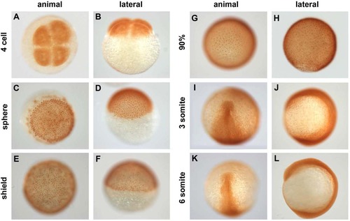Spatiotemporal distribution of Pou5f1 in wild-type (WT) embryos. A–L: Pou5f1 distribution in whole-mount WT embryos from four-cell to six-somite stages analyzed by anti Pou5f1 HRP/DAB immunohistochemistry. Animal views (A,C,E,G,I,K), dorsal to the bottom (E,G,I,K), and lateral views (B,D,F,H,J,L), dorsal to the right (F,H,J,L). EXPRESSION / LABELING: