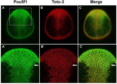 Pou5f1 in dorsal ectoderm cell nuclei in wild-type (WT) embryos at one-somite stage. A–C: Confocal images of anti-Pou5f1 immunofluorescence (green) WT whole-mount embryos at one-somite stage in which all cell nuclei were stained with TOTO-3 (red). A′–C′: Higher magnification of rectangle area in A is shown. Arrows indicate region from which on reduced Pou5f1 levels are detected in the caudal neural plate. Dorsal views, animal pole to the top. EXPRESSION / LABELING:
