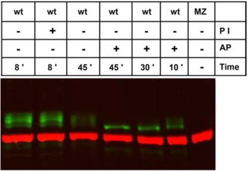 Pou5f1 modification by phosphorylation. Western blot analysis of 70% epiboly stage embryo extracts treated at 37°C with phosphatase inhibitor (PI) or alkaline phosphatase (AP) for defined periods (indicated at bottom). Pou5f1-positive protein bands were detected around 60 kDa in wild-type (WT) but reduced to a band of approximately 57 kDa molecular mass upon AP treatment. Anti-α-tubulin was used as loading control (red, 55 kDa). EXPRESSION / LABELING:
