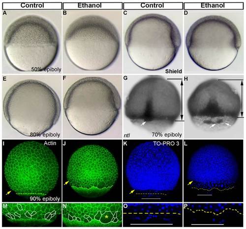 Ethanol exposure reduces epiboly progression and dorsal forerunner cell aggregation. (A–F) Live embryos at 50% epiboly (A,B), shield (C,D), and 80% epiboly stages (E,F) showed reduced epiboly progression in the ethanol treated embryos (B,D,F) compared to control (A,C,E). (G,H) In situ hybridization depicting ntl showed epiboly delay in the deep cells and obvious separation of the dorsal forerunner cells from the deep cell margin in the ethanol treated embryo (H). Black lines with arrows indicate the distance between the deep cell margin and the animal pole. White arrows: dorsal forerunner cells. (I,J) 3D renderings of confocal microscopy optical sections of phalloidin stained (F-actin) gastrulae. Yellow arrowhead: deep cell margin; yellow perforated line: EVL margin. (K,L) 3D renderings of confocal microscopy optical sections of TO-PRO-3 stained embryos showed deep cells nuclei, EVL cell nuclei and YSL nuclei. Yellow arrowhead: deep cell margin; yellow perforated line: EVL margin drawn from F-actin staining (I,J); white line: yolk syncytial nuclei margin. (M,N) High magnification images of control and ethanol treated embryos highlighting cell boundaries of a few EVL cells. Cells at the embryo margins in the control embryo showed elongated EVL cells, roughly perpendicularly aligned to the EVL margin (M). Ethanol treated embryos showed rounder and not correctly aligned EVL cells (N). Yellow asterisk indicates big multinucleated cell. (O,P) High magnification images of the TO-PRO-3 stained control and ethanol treated embryos. Control embryos showed YSL nuclei proceeded beyond the EVL (O). Ethanol treated embryos showed fewer YSL nuclei proceeded beyond the EVL. EXPRESSION / LABELING: