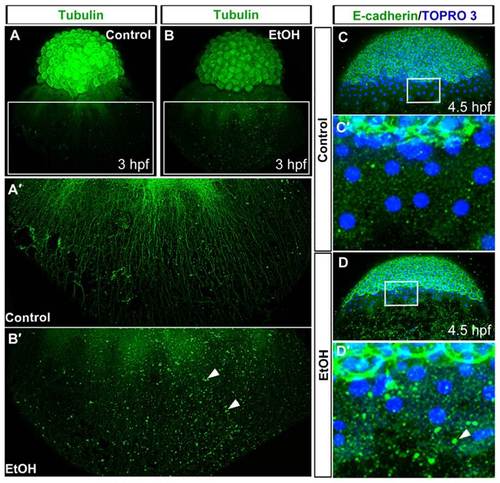 Ethanol exposure disrupts yolk cell microtubule and E-cadherin distribution. (A,B) 3D renderings of confocal microscopy optical sections of anti-α-tubulin antibody stained embryos showed microtubule organizations in the control (A) and ethanol treated (B) embryos at 3hpf. (A′,B′) High magnification image of the boxed regions of embryos showed arrays of yolk cell microtubule extending toward the vegetal pole in the control (A′) and abnormal arrays of yolk cell microtubules in the ethanol treated embryo (B′). Arrowheads indicate aggregates of α-tubulin in the yolk cell. (C–D′) 3D images of confocal microscopy optical sections of anti-E-cadherin antibody stained embryos showed E-cadherin distribution in the control (C) and ethanol treated (D) embryos at 4.5hpf. High magnification image of the boxed region of the control embryo showed relatively small aggregates of E-cadherin in the yolk cell (C′) than ethanol treated embryos, which had large aggregates of E-cadherin in the yolk cell (D′). Arrowhead indicates large E-cadherin aggregate. PHENOTYPE: