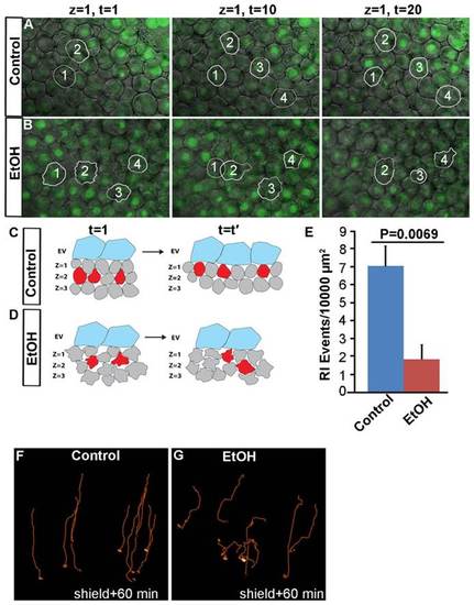 Ethanol exposure affects radial intercalation and gastrulation cell movements. (A,B) Confocal microscopy optical sections from the time-lapse image sequences at the most external epiblast layer of FITC-labeled histone-1 injected control (A) and ethanol (B) treated embryos at 4.5hpf. Solid white line highlights representative cells in the upper layer, dotted line indicates cell in the lower layer. (C,D) Schematic diagrams illustrating radial intercalation (RI) events in the control (C) and ethanol treated (D) embryos. Unlike control, ethanol treated cells showed lamellipodia extension in all directions. (E) Histogram showing RI events in the control and ethanol treated embryos. (F,G) The paths of ten deep cells in the mesendoderm of control and ethanol treated embryos. Cells in ethanol treated embryos showed abnormal trajectories. Animal pole, top; vegetal pole, bottom. PHENOTYPE: