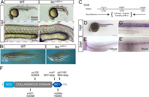 lev zebrafish mutant alleles disrupt the col8a1a gene. (A) Representative col8a1a (e.g. levm531-/-) mutant embryo displaying kinking of the notochord (red arrowhead) and shortened body axis at 1 dpf. (B) Representative homozygous col8a1a mutant adult (e.g. levvu41-/-) displays shortened body axis. (C) The levvu41 lesion was meiotically mapped to a region of chromosome 9 between the markers z13213 and z34459 (number of recombinants are noted at each region) and was most highly associated with the SNP, rs40743937 in our bulk segregant analysis. According to the ensemble map (ZV9), 32 genes are located within this critical region flanked by the SSLP markers, including the col8a1a. (D–E′) col8a1a in situ hybridization at 1dpf (D and D′) showing robust expression in several midline structures at 1dpf including the floor plate, chordamesoderm/notochord, and hypochord. At 2dpf (E and E′), the expression is specific to the large vacuolated cells. (F) Structure of the predicted 711-amino acid zebrafish Col8a1a protein. The N-terminal NC2 domain and C-terminal NC1 domain flank the more-canonical collagenous domain. The NC2 domain is thought to be a propeptide domain lost during maturation, whereas the collagenous and NC1 domains are important for trimerization and supermolecular network formation respectively. The G309E (levm531) and G365S (levvu105) substitutions are located within the collagenous domain (gray box); the 607 nonsense mutation (levvu41) resides just N-terminal to the NC1 domain and the previously described gulm208a mutation. PHENOTYPE: