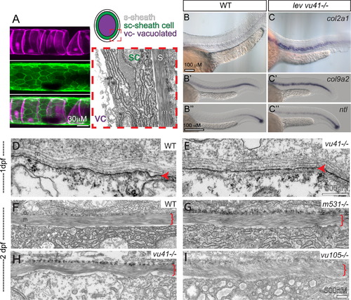 col8a1a mutations disrupt the normal morphology of the notochord sheath. (A) The primary components of the notochord tissue at embryonic maturation illustrated with a confocal (A, B, and C), cartoon (D), and transmission electron micrographs (TEM) (E). The large vacuolated cell layer (VC; Tg(TK5xC twhh:memRFP) expression; magenta), surrounded by a sheath epidermis (SC; 1.75KB col2a1 GFP-CAAX; green) are shown in a lateral view with a confocal projection. The cartoon and the TEM image are transverse views highlighting the extracellular tri-laminar notochord sheath (S) composed of laminin-, collagen- and elastin-rich components. (B–C′′) Representative examples of in situ hybridization of chordamesodermal genes col2a1 (B and C), col9a2 (B′ and C′), and ntl (B3, C3) in WT (B–B′′) and levvu41 mutant (C–C′) embryos. (C) The expression of col9a2 and ntl transcripts is upregulated, especially in more anterior regions of the notochord (C′ and C′′) as compared to time matched sibling embryos (B′ and B′). TEM of transverse sections from WT and mutant embryos at 2dpf (D–I). (D) WT notochord at 1 dpf. (E) levvu41-/- notochord at 1dpf. (F) WT notochord sheath at 2dpf display very straight, well organized medial sheath layer. Extracellular notochord sheaths of lev m531-/- (G), levvu41-/- (H), and lev vu105-/- (I) mutants exhibiting a wavy, disordered organization of the medial layer at 2dpf. I – inner laminin-rich layer, m – medial, and o – outer collagen-rich layers of the extracellular sheath; SC – sheath cell, S – extra-cellular sheath, and VC – vacuolated cell. |