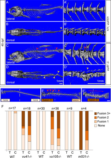 Homozyogus col8a1a mutant adults display vertebral fusions and scoliosis. MicroCT imaging of WT (A–B′) and col8a1a mutant zebrafish (C–D′) adults (45dpf) (A–E′′) in both lateral views (A, C, E–E′′) with insets (A′ and C′) and dorsal views (B and D) with insets (B′, D′) (A, A′, and B′) WT vertebrae with one neural and hemal arches per vertebral body. (B) Representative scoliosis in the tail of a WT adult (yellow arrowhead). (C and C′) Representative levvu41-/- zebrafish with VM (red arrowheads). (D and D′) Representative levvu41-/- multiple scoliosis along the axis (yellow arrowheads) and (E–E′′) Representative individuals scored for the presence of individual VM (red arrowheads) or complete fusion of vertebral column (red bracket) in the thoracic or caudal regions (as number of fused regions). (F) Graphed categorical data of VM from all lev alleles and unaffected WT siblings in thoracic (T) and caudal (C) regions. All scale bars (A–D), (A′–D′), and (E–E′′)=1 mM. PHENOTYPE: