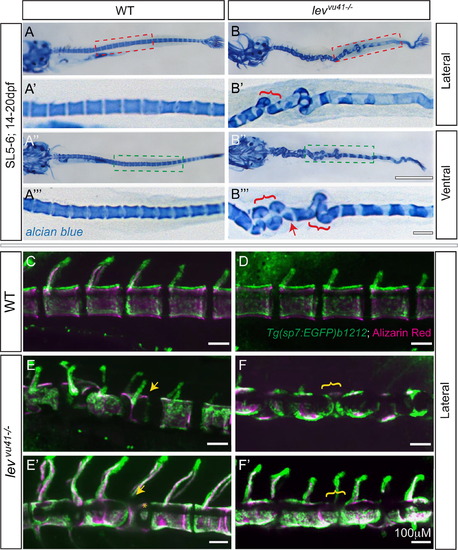 Segmentation of the vertebral column and localization of osteoblasts proceeds on a dysmorphic notochord template. Alcian blue stained larvae (14dpf) (A–B′′′) with lateral insets (red dashed box; A′, B′) and ventral insets (green dashed box; A′′′, B′′′). (A–A′′′) WT larvae display well-formed and segmented centra. (B–B′′′) levvu41-/- larvae display abberant apposition of centra (red brackets) and hemicentra (red arrow). Confocal projections of zebrafish vertebral column at 21dpf, illustrating boney matrix (alizarin red in magenta) and osteoblasts (Tg(sp7:EGFP)b1212 in green) (C–F′). (C, D) WT vertebrae and associated osteoblasts are well segmented along the vertebral axis. (E, E′) An individual levvu41-/- mutant displaying segmented colocalization of osteoblast and centra, including malformed hemivertebrae (yellow arrows) that continues to have mostly well segmented osteoblasts (E′), excepting some ectopic osteoblast-mineral formations in regions previously devoid of osteoblasts or mineral (E′, yellow asterix). (F and F′) An individual levvu41-/- mutant displaying regions of severe notochord bending with aberrantly apposed osteoblasts (F, yellow bracket), those progresses to a region with more complete osteoblast coverage (F′, yellow bracket). (C,D) 10dpf; ~SL3-4 (E,F) 10dpf; ~SL3-4 (E′, F′) 14dpf; ~SL4-5. Scale bars for (A, B, A3, B3)=1 mM; (C–F′) and (A′, A′′′,B′,B′′′)=100 mM. EXPRESSION / LABELING: