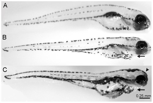 Ethanol treatment affects the development of larval zebrafish. Zebrafish embryos were raised in varying concentrations of ethanol (0% through 1.5% by volume) from 2 days post-fertilization (dpf) to 5 dpf, fixed, and imaged. (A) Untreated control animals appear normal. (B) 1% ethanol-treated animals have a slightly swollen heart (arrow) and no swim bladder but otherwise appear normal. (C) Increasing the concentration of ethanol treatment to 1.5% resulted in embryos exhibiting swollen hearts (arrow), swollen guts (#), missing a swim bladder (white asterisk), and inhibited craniofacial development (arrowhead), which is similar to the phenotype exhibited by children with FAS. PHENOTYPE: