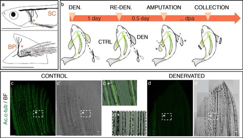 Adult zebrafish pectoral fin denervation assay. a) Pectoral fin innervation. The zebrafish pectoral fin is innervated by both sensory and motor nerves that descend from the spinal cord (SC) and enter the pectoral fin region medially, as a combined brachial plexus (BP) (*). Sensory and motor axons then branch to serve the pectoral muscles and fin rays. Sensorial nerves run both along the intra and inter-ray regions (adapted from [38],[39). b) Denervation assay. The right pectoral fin was denervated (DEN) by transecting the nerve fibres in the brachial plexus region, while the left fin served as an innervated control (CTRL). In the next day, the right fin was re-denervated to assure total nerve degeneration. After 6–8 hours both fins were amputated and the discarded tissue (*) was collected for ac. α-tub staining. Fish were placed in 33°C water tanks and regeneration was allowed to proceed. Re-denervation took place every day after amputation, to avoid nerve recovery. Regenerates were collected for further analysis at specific time points post-amputation. c,d) Pectoral fin denervation efficiency. Staining for ac. α-tub in whole mount fins shows that nerve ablation at the level of the brachial plexus is efficient to deprive pectoral fins from its innervation. An innervated control fin (c,c′), with bundles of axons running in the inter and intra-ray region (c* - magnification of the boxed region in c), contrasts with a denervated fin (d,d′), with fewer or any presence of the axonal marker ac. α-tub, inside and outside bony rays (d*- magnification of the boxed region in d). The images are a projection of confocal optical slices. Scale bar - 100 µm. |