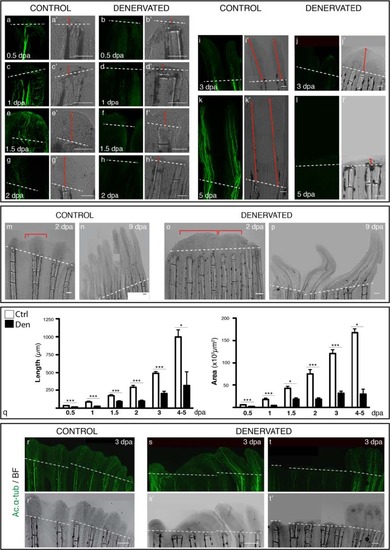Analysis of pectoral fin regeneration, upon denervation. a-l) Staining for ac. α-tub in whole mount fins confirms the absense of nerve fibres at the amputation site of denervated fins. Brightfield images demonstrate the difference in the extent of regeneration among fins (a′-l′). At 0.5 and 1 dpa denervated fins (b,d) have a WE that is thinner than controls (a,c). From 1.5 to 5 dpa, denervated fins are not able to form a normal blastema and regenerate (f,h,j,l). In some cases the blastema is completely absent (h′,l′), while in others a smaller and defective blastema is formed and fins regenerate partially (f′,j′). Red arrowed solid lines indicate regenerated tissue length. m-p) Defective denervated regenerating fins. Denervated fins regenerate defectively and form “merged blastemas” on adjacent rays. The “wavy” appearance of new control fins, where each ray has its own cone shaped blastema (m-bracket), contrasts with denervated fins, where apparently several rays share a single, merged blastema (obracket). At 9 dpa denervated fins with a similar extent of regeneration as the controls (n), present a defective patterning (p). q) Quantification of the area and length of regenerated tissue. Measurements taken from the amputation site to the most distal tip reveal a consistent significant reduction (***p < 0.0001, *p < 0.05) of denervated fins in relation to controls. r-t) Influence of nerve quantity in fin regeneration. Staining for ac. α-tub. in whole mount fins at 3 dpa show equal innervation and regeneration of control rays within the same fin (r), while denervated fins, the rays with less or no innervation present less or no regeneration (s,t), suggesting that the success of regeneration depends on the quanity of innervation for each ray. a-q and s-t) The images are a projection of confocal optical slices. Dashed lines mark amputation plane. Scale bar - 100 &3181;m. |
