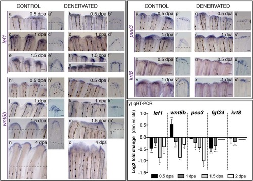 Gene expression in the WE of control and denervated fins. a-x) mRNA ISH on whole mount amputated fins: lef1, wnt5b, pea3, krt8. a′-x′) Longitudinal sections of the rays using whole mount ISH. a-g)Lef1 is expressed from 0.5 to 1.5 dpa in the BEL of both control (a,c,e) and denervated fins (b,d,f,g). At 1.5 dpa lef1 is expressed in the inter-ray region of non-regenerating (f) and partially regenerating denervated fins, where it forms what seems a shared BEL on contiguous rays (g*). h-o)Wnt5b is expressed in the WE of both control (h,j,l,n) and denervated fins (i,k,m,o) from 0.5 to 4 dpa. [The arrowhead in h′ indicates expression, staining in the WE is an artefact]. In denervated fins, after 1.5 dpa, wnt5b presents a spread and de-regulated expression domain (m). p-s)Pea3 is expressed in both control and denervated fins at 0.5 and 1 dpa, with a reduced expression in denervated fins (q,s). In controls pea3 is expressed in the whole WE (p′,r′), while in denervates is restricted to the distal WE cells (q′,s′). t-x)Krt8 is expressed in both control (t,v) and denervated fins (u,x) at 0.5 and 1 dpa, with a reduced expression in denervates (u,x). While in controls krt8 is strongly expressed in the whole WE (t′,v′), in denervates it is restricted to some epidermal cells in the distal tip (u′,x′). a,a′-x,x′) Dashed lines mark amputation plane. Scale bar - 100 µm in whole mount; 25 µm in sections. y) qRT-PCR for genes expressed in the WE. qRT-PCR analysis shows a decrease in the expression levels of analysed genes on denervated fins, in relation to controls, from 0.5 to 2 dpa, except for wnt5b, which is increased at 0.5 dpa. Note: ***p < 0.0001, *p < 0.05. Data not evaluated for krt8 and fgf24, at 1.5 and 2 dpa. |
