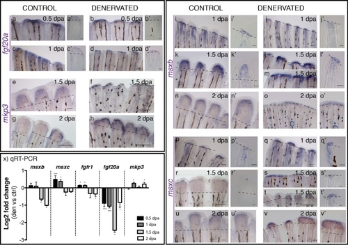 Gene expression in the blastema of control and denervated fins. a-v) mRNA ISH on whole mount amputated fins: fgf20a, mkp3, msxb, msxc.a′-l′, p′-t′) Longitudinal sections of the rays using whole mount ISH. a-d)Fgf20a expression is detected at 0.5 and 1 dpa in control fins (a,c) and only a residual expression is detected in denervated fins (b,d). e-k)Mkp3 is detected at 1.5 dpa in control (e) and denervated fins (f). At 2 dpa the expression in denervated fins is reduced but stronger (h) than in controls (g). i-o)Msxb expression starts at 1 dpa in both control and denervated fins. At 1.5 dpa denervated rays that have partially regenerated (m) present msxb expression spread in the inter-ray tissue (*). msxb expression is still detected at 2 dpa, however, in denervated fins is reduced to a thin domain (o). p-v)Msxc expression is present in both fins at 1 dpa, but with a stronger expression in denervated fins (q,q′). Expression is maintained after 1.5 dpa in non-regenerating (s,s′) and partially regenerating fins (t,t′). At 2 dpa, msxc is expressed as a continuum in the tip of partially regenerating denervated fins, in what seems a “merged blastema” (Adult zebrafish pectoral fin denervation assay.,v′). a,a′-v,v′) Dashed lines mark amputation plane. Scale bar - 100 µm in whole mount fins; 25 µm in sections. x) qRT-PCR for genes expressed in the blastema. qRT-PCR analysis shows an increase in the expression of msxc and fgfr1 on denervated fins at 0.5 and 1 dpa, as well as in mkp3 at 1 and 2 dpa, when compared to controls. Fgf20a levels of expression are always decreased in relation to the controls, as it is msxb at 1.5 and 2 dpa. Note: ***p < 0.0001, *p < 0.05. |