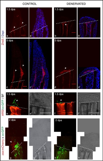 Scleroblasts alignment in amputated fins, upon denervation. a-d) Staining for Zns5 and DAPI in longitudinal sections shows that between 1 and 1.5 dpa, Zns5-positive cells start to accumulate just distal to the amputation plane in control fins (a-arrowhead). However, in denervated fins scleroblasts are not aligned with the stump rays, but instead are deposited between the 2 hemi-rays (b-arrowhead). At later time points the scleroblast deposition covers the tip of denervated rays (d). e,f) Live imaging with the Tg (oc:GFP) co-stained with Alizarin red-S (ARS). In vivo imaging of Tg (oc:GFP) stained with ARS shows that mature bone cells (oc-positive) of control fins are localized at the amputation level and in the blastema (e-arrowhead). However, in denervated fins oc-positive cells do not migrate further than the amputation plane (f-arrowhead). g,h) Live imaging with the transgenics Tg (oc:GFP), Tg (osx:mCherry) and ARS. Zebrafish transgenic line resulting from an outcross between Tg(oc:GFP) and Tg(osx:mCherry) shows that at 2 dpa only control fins present oc-positive and osx-positive cells in the blastema (g-arrowhead). a-h) The images are a projection of confocal optical slices. Dashed lines mark amputation plane. a-d) Scale bar - 25 µm. e-h) Scale bar - 100 µm. |