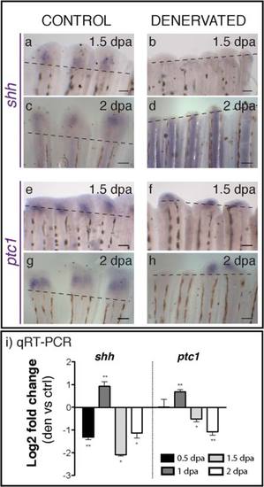 Shhandptc1expression in control and denervated fins. a-h) mRNA ISH on whole mount amputated fins. Shh expression is first detected at 1.5 dpa in the blastema of control fins (a), but not in the denervated ones (b). Ptc1 mRNA starts to be expressed in the stump at 1 dpa both in control (e) and denervated fins (f). While in control fins ptc1 is expressed in every ray at 2 dpa, in denervated fins it is expressed only in the rays with a small blastema (h). a-h) Dashed lines mark amputation plane. Scale bar - 100 µm. i) qRT-PCR for shh and ptc1. qRT-PCR reveals lower levels of shh expression on denervated fins in relation to controls, at 0.5 dpa. These levels abruptly increase at 1 dpa, decreasing again at 1.5 and 2 dpa. Ptc1 expression is also higher at 1 dpa and lower at 1.5 and 2 dpa on denervated fins, in relation to controls (**p < 0.001, *p < 0.05). |