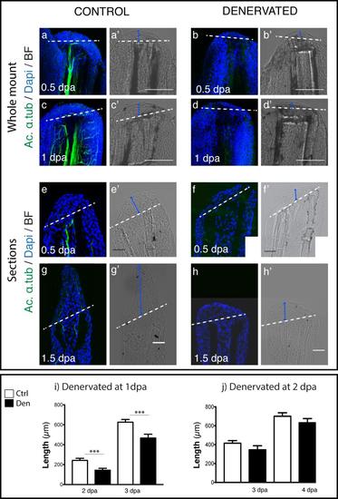 Analysis of the regenerative process of denervated pectoral fins. a-d) Staining for ac. α-tub and DAPI in whole mount fins. Staining with DAPI confirms that fins without innervation (b,d) have a WE with less epidermal cell layers than controls (a,c). e-h) Staining for ac. α-tub and DAPI in sections. Staining with DAPI shows that fins without innervation (e) have a WE with less epidermal cell layers than controls (f). After 1.5 dpa denervated fins (h) are not able to regenerate as the controls (g). a-h) Dashed lines mark amputation plane. i,j) Quantification of the length of regenerated tissue in fins denervated after amputation. Measurements of the length of regenerated tissue, taken from the amputation site to the most distal tip. i) There is a consistent significant reduction (***p < 0.0001) in the length of fins denervated at 1 dpa in relation to controls, both at 2 and 3 dpa. j) There is no significant reduction in the length of regenerates in fins denervated at 2dpa in relation to controls (fix at 3 dpa p = 0.33; fix at 4 dpa p = 0.07). |