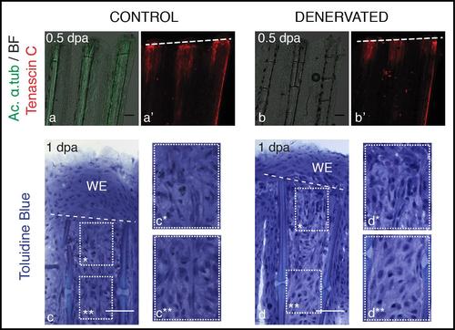 Mesenchymal tissue disorganization after amputation of denervated fins. a,b) Staining for Tenascin C and ac. α-tub in whole mount fins at 0.5 dpa. Tenascin C is present in the mesenchymal tissue under the amputation plane, both in control and denervated fins. c,d) Toluidine Blue histology in longitudinal sections. Longitudinal sections stained with toluidine blue show that at 1 dpa mesenchymal tissue becomes more disorganised below the amputation plane, with cells presenting a more elongated shape that suggests cell migration, in both control (c*) and denervated fins (d*), while more proximal mesenchymal tissue presents a more organized structure (c**, d**). a-d) The images are a projection of confocal optical slices. Dashed lines mark amputation plane. a,b) Scale bar - 100 µm. c,d) Scale bar - 50 µm. |