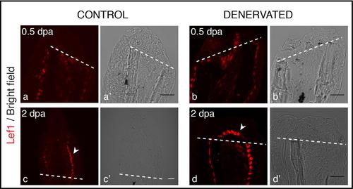 Staining for Lef1 in longitudinal sections after amputation of denervated fins. Lef1 protein is detected in the BEL of both control and denervated fins from 0.5 to 2 dpa. At 0.5 dpa Lef1 expression is similar in control (a) and denervated (b) fins. At 2 dpa Lef1 is restricted to the most proximal BEL cells in control fins (c-arrowhead) and it is expressed all over the BEL lining mesenchymal cells of denervated fins (d-arrowhead). Scale bar - 25 µm. a-d) The images are a projection of confocal optical slices. Dashed lines mark amputation plane. Scale bar - 25 µm. |