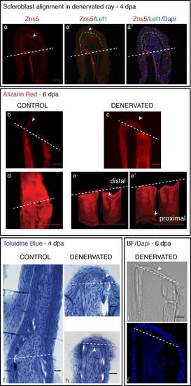 Bone deposition in the amputation plane of denervated fins. a) Staining in longitudinal sections for Zns5, Lef1 and DAPI. Zns5-positive cells accumulate below the BEL of denervated fins, forming an arch that delimits mesenchymal cells. Lef1 is ectopically expressed in the whole BEL (a′). b,c) Staining with ARS in longitudinal sections. Alizarin Red staining at 6 dpa shows mineralization of the newly formed ray along the old bony ray in control fins (b-arrowhead), while in denervated fins it shows bone deposition in at the amputation level (c -arrowhead). d,e) Staining with ARS in whole mount fins. The deposition of bone cells in the amputation site causes a thickening in the distal stump of deneravated fins. A 3D projection of denervated rays shows that the distal region (e-arrowhead) is comparatively thicker in relation to the proximal region (e′-arrowhead). f-h) Toluidine Blue histology in longitudinal sections. At 4 dpa cell deposition between the 2 hemi-rays is observed in denervated fins (g,h). The new structure resembling bone matrix seems to be derived from the old bone (g - arrowhead) and a group of cells, resembling bone cells, are deposited at the level of amputation almost closing the ray (h - arrowhead). i) DAPI staining in longitudinal sections. At 6 dpa a bright field image shows matrix deposition at the level of amputation between the two hemi-rays (arrowhead). a-e, i) The images are a projection of confocal optical slices. Dashed lines mark amputation plane. a,e) Scale bar - 25 µm. b-d) Scale bar - 50 µm. |