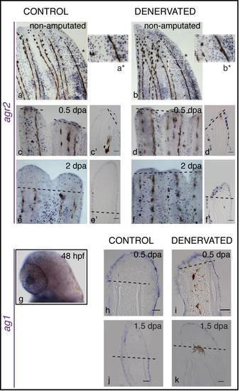 Expression of nAg homologues in zebrafish. a-f) Whole mount mRNA ISH of agr2. c′-f′) Longitudinal sections of the rays using whole mount ISH. Agr2 mRNA is expressed in the mucous secreting cells of the entire epidermis in both non-amputated (a,b) and amputated fins (c-f). During regeneration, agr2 is also expressed in the mucous secreting cells present in the newly formed WE. There are no obvious differences between control (a,c,e) and denervated fins (b,d,f) in the amount of agr2- positive cells, in both non-amputated fins and during regeneration. g-k) Whole mount mRNA ISH of ag1. g) Ag1 mRNA is expressed in the mucous secreting cells of the larvae body at 48 hours post fertilization (hpf). h-k) Longitudinal sections of the rays using whole mount ISH show wide expression of ag1 in the epidermis and WE of adult fins, as early as 0.5 dpa, and throughout regeneration. There are no differences in ag1 expression between control and denervated fins, in both non-amputated and amputated fins. |