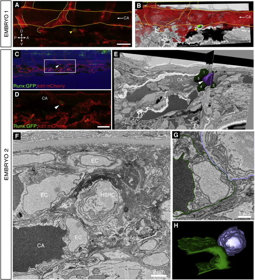 High-Resolution Electron Microscopy of Endogenous HSPC in the Perivascular Niche, Related to Figure 6 (A and B) Embryo 1 (same embryo as shown in Figure 6). Comparison of 3D projections from (A) confocal z-stack data and (B) serial EM scans to confirm the position of the lodged HSPC. (A) 3D rendered projection of z-stack (Imaris software) showing one lodged Runx:GFP+ HSPC (green; arrowhead) and kdrl:mCherry+ ECs (red). Scale bar: 25 µm. (B) Vessel lumen manually outlined, surface rendered, and shown in red (Imaris software). 3D projection overlaid on a single EM section. Rotation performed to match orientation of image in (A). Orientation: D (dorsal), V (ventral), A (anterior), P (posterior). CA (caudal artery). Circulation is toward the posterior (left; arrow). Major vessels outlined. (C–H) Embryo 2. A second independent example of serial block face EM sections on a lodged HSPC after time-lapse. (C) Last frame of CHT time-lapse (60 hpf). Arrowhead marks HSPC lodged > 6 hr. Runx:GFP green; kdrl:mCherry red; bright field blue. Anterior left, posterior right, dorsal top, ventral bottom. (D) Detail of region in (C) marked by box. The brightness of the GFP channel was adjusted independently of the mCherry channel to clearly show the position of the Runx:GFP+ HSPC. Scale bar: 25 µm. (E) Single section and orthogonal slice from serial block face EM scans. Lodged HSPC is purple (arrowhead), surrounding EC nuclei are green and numbered. Part of the HSPC is missing because it was not captured in serial EM sections. (F) High resolution EM section of HSPC in perivascular niche with cell nuclei labeled. (G) EM section with cell membranes outlined to show contact between EC (dark green) and HSPC (purple). (H) 3D modeling shows one side of the HSPC is in contact with the EC. For animated 3D reconstructions see Movie S7. |