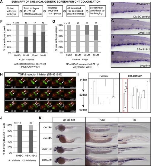Chemical Genetic Screen to Identify Small-Molecule Regulators of CHT Niche Colonization, Related to Figure 7 (A) Overview of chemical screen. (B–E) whole mount in situ hybridization (WISH) of cmyb/runx1 probes in the CHT of 72 hpf embryos. Treatments from 48-72 hpf as indicated. (B) DMSO control with normal expression. (C–E) (C) Low expression after 25 µM AMD3100 treatment. High expression after treatment with (D) 40 µM SB-431542 or (E) 25 µM lycorine. (F and G) Wild-type AB embryos were treated from 48-72 hpf and scored as in (B-D). The percentage of total is shown. Number of embryos scored at top. (F) Dose-dependent decrease in cmyb/runx1 expression levels with increasing concentrations of CXCR4 antagonist AMD3100. The linear regression of Y (response) on X (dose) is significant: r2 = 0.3567, p = 7.84E-9. (G) Dose-dependent increase in cmyb/runx1 expression levels with increasing concentrations of TGF-β inhibitor, SB-431542. The linear regression of Y (response) on X (dose) is significant: r2 = 0.275081, p = 1.61E-6. (H) Selected frames from time-lapse movie of a Runx:GFP;kdrl:RFP double transgenic embryo treated with TGF-β inhibitor, SB-431542. In < 90 min, an HSPC (a) undergoes rounds of division and releases daughter cells (b,c,e) into circulation (daughter cell (d) was not released by the end of the movie; caudal artery, CA; circulation to posterior, right). Scale bar: 10 µm. (I) Lineage tree analysis of HSPCs tracked in parallel time-lapse movies, with and without SB-431542 treatment, from 44-60 hpf. One line is one continuously tracked HSPC from the time it enters the CHT field of view until it exits. Branch points mark clear cell divisions. The red box marks the lineage of the cells shown in (H). (J) Results from cell divisions scored in Runx:GFP+ time-lapse movies with DMSO or SB-431542 treatment, from 44-60 hpf. The percentage of total dividing cells scored. Total number of dividing cells scored at the top. Data collected from Runx:GFP+ time-lapse movies: DMSO treatment (11 embryos imaged; 42 Runx:GFP+ cells scored; 12/42 cells dividing; 0/12 cells dividing 2-3 times); SB-431542 treatment (15 embryos imaged; 79 Runx:GFP+ cells scored; 28/79 cells dividing; 5/28 cells dividing 2-3 times). (K) Whole mount in situ expression patterns of cxcr4a, cxcr4b, cxcl12a, and cxcl12b (stages range between 34-38 hpf). For each example a detail of the trunk and tail is shown, with the dorsal aorta and CHT, respectively, marked with dashed white boxes. All genes are expressed in the head and lateral line. cxcr4b but not cxcr4a is expressed in the CHT. cxcl12a and cxcl12b are expressed in the dorsal aorta and CHT. |