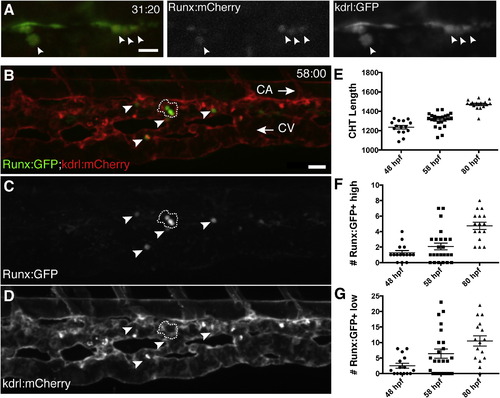 A Transgenic Zebrafish Line that Specifically Marks HSPCs (A) Single frame of time-lapse (hr post fertilization:min) showing Runx:mCherry+ HSPCs (arrowheads, red nuclei) budding from kdrl:GFP+ hemogenic endothelium of DA (green). See Movie S1. (B–D) CHT is colonized by Runx:GFP+ HSPCs (green) that are closely associated with kdrl:mCherry+ ECs (red). Caudal artery (CA) is dorsal to CHT, caudal vein (CV) is ventral, and circulation runs posterior (right arrow) and anterior (left arrow), respectively. Cluster of three Runx:GFP+ high cells outlined with dashed line and four Runx:GFP+ low cells indicated with arrowheads. 58 hpf embryo. (E–G) Runx:GFP+ high and low cells quantified, with CHT length as indicator of stage (anterior from cloaca to posterior limit of CA). Note: confocal images are 3D rendered depth or max projections of 20–30 µm z stacks. Scale bars, (A) 15 µm; (B) 25 µm. Error bars show mean ± SEM. See also Figure S1. |