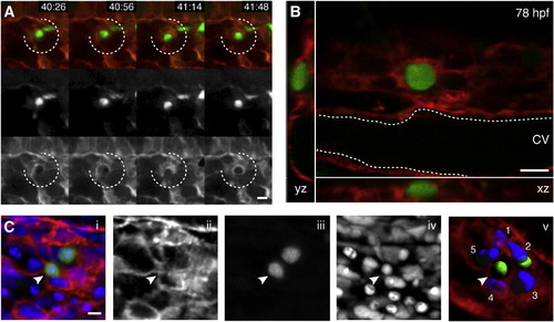 Endothelial Cells in the Perivascular Niche Remodel to Surround a Single HSPC (A) Four frames from time-lapse Movie S2 40–42 hpf (hr post fertilization:min). Upper row is a merge of Runx:GFP+ HSPC (green, middle row) and kdrl:RFP ECs (red, lower row). A group of surrounding ECs (broken circle) remodel around a single HSPC soon after its arrival. (B) Higher magnification (60×) live image of single Runx:GFP+ HSPC surrounded by kdrl:mCherry ECs at 78 hpf (orthogonal views). (C) 3D rendered projection of scanning confocal image from fixed 80 hpf embryo. (i) merge, (ii) kdrl:mCherry ECs, (iii) Runx:GFP+ HSPCs, (iv) DRAQ5 nuclei, and (v) kdrl:mCherry projection with 3D modeled green HSPCs and five blue surrounding EC nuclei (arrowhead indicates HSPC in EC surround). All views: dorsal up, ventral down. Scale bars, 10 µm. See also Figure S3. |