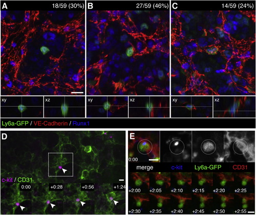 Endothelial Cells Surround HSPCs in the Fetal Liver Microenvironment (A–C) FLs from E11.5 Ly6a-GFP mice were fixed and stained for immunofluorescence with anti-VE-Cadherin (red), anti-Runx1 (blue), and anti-GFP (green) antibodies. We scored 59 Ly6a-GFP+/Runx1+ cells from 3 FLs and identified 3 different HSPC-EC configurations: (A) abluminal with no contact between HSPC and ECs (18/59; 30%); (B) EC contact on one side of the HSPC (27/59; 46%); and (C) HSPC surrounded on all sides with ECs (14/59; 24%). See Movie S3. (D) c-kit+ cell (magenta) adhered to CD31+ ECs (green) in one lobe of an E11.5 FL (arrowhead). White box marks details below. Time-lapse frames show in <90 min the HSPC migrates into a field of ECs. Soon after, ECs surround HSPC to form niche. See also Movie S4. (E) c-kit+(blue)/Ly6a-GFP+(green) HSPC adhered to abluminal side of CD31+ EC (red). Following this cell >2 hr (1 frame/5 min) shows a division with distal and proximal daughters relative to sinusoid; the latter remains in an endothelial surround. See also Movie S5. Confocal images: 3D rendered depth projection (A, B, C, and E), orthogonal view (A, B, and C below), maximum projection (D) of z stack. Scale bars, 10 µm. See also Figure S4. |