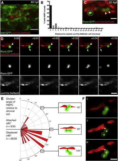 HSPCs Are Anchored to Perivascular Stromal Cells during Cell Divisions (A) cxcl12a:DsRed2+ stromal cells (red) underlie kdrl:GFP+ ECs (green). 40 hpf embryo. (B) Percentage of HSPCs in CHT scored by distance to nearest stromal cell (n = 168 total cells from 25 embryos). (C) Detail of Runx:GFP+ HSPCs (green) in proximity to cxcl12a:DsRed2+ stromal cells (red). Arrowheads mark HSPCs in contact with stromal cell. Circle marks HSPC with 2 µm gap between it and stromal cell. 60 hpf embryo. (D) Six frames selected from time-lapse Movie S6 (hr:min). Top row is a merge of Runx:GFP+ HSPC (green, middle row) and cxcl12a:DsRed2+ stromal cells (red, lower row). Proximal HSPC anchored to stromal cell (arrowhead) divides and releases distal daughter cell into circulation (arrow). (E) Rose diagram showing division plane of HSPC oriented relative to stromal cell. Majority of divisions result in displaced daughter cell (n = 26/35 cell divisions from 22 embryos; 95% confidence interval 0.567—0.875; mean division angle of 110°). Diagrams show HSPCs dividing over stromal cell surface (45°), perpendicular to stromal cell (90°), or displaced away from stromal cell (135°). Angles may be affected by release into flow of circulation. (F) 3D models used to measure HSPC divisions relative to stromal cells. (i) Volume rendered confocal image. (ii) 3D model showing angle measurement between attachment point on stromal cell surface and center points of proximal and distal HSPCs (example shown is 110°). (iii) Overlay of confocal image and 3D model. Scale bars, (A) 25 µm; (C and F) 10 µm; (D) 15 µm. |