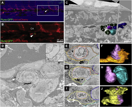 High-Resolution Electron Microscopy of Endogenous HSPC in the Perivascular Niche (A) Last frame of CHT time lapse (60 hpf). Arrowhead marks HSPC lodged >6 hr. Runx:GFP (green), kdrl:mCherry (red), bright field (blue). Anterior left, posterior right, dorsal top, ventral bottom. (B) Detail of region in (A) marked by box. (C) Single section and orthogonal slice from serial block face EM scans. Lodged HSPC (purple, arrowhead), surrounding EC nuclei (green, numbered), and stromal cells (dark and light blue). (D) High-resolution EM of HSPC lodged in perivascular niche ventral to DA. The HSPC is in direct contact with one stromal cell (see higher-magnification inset). (E–J) Selected sections (left) through niche with cell membrane traces used to build 3D models (right). (E) In this section, the HSPC (purple) is mostly surrounded by EC (orange). Portions of fibroblastic (yellow) and stromal (light and dark blue) cells are visible. (F) About half of the HSPC surface is wrapped by EC. (G) The HSPC directly contacts the stromal cell. Portions of the fibroblastic cell, EC, and second stromal cell are visible. (H) Only the midsection of the HSPC contacts the stromal cell. (I) The fibroblastic cell surrounds the HSPC. Portions of two stromal cells are visible. (J) Most of the HSPC surface is wrapped by the fibroblastic cell. Scale bars, (B) 25 µm; (C) 10 µm; (D) 2 µm; and inset, 1 µm. See also Figure S5 and Movie S7. |