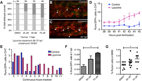 Modulating HSPC Niche Colonization with Lycorine Has Long-Term Effects on the Stem Cell Pool (A) Lycorine treatment dose-dependently increases the percentage of embryos with high cmyb/runx1 expression levels, as shown in Figure S6E (linear regression of Y [response] on X [dose] is significant: r2 = 0.146607, p = 6.46 × 109). (B and C) Stage-matched frames from parallel time-lapse movies show more HSPCs (arrowheads) with (C) 25 µM lycorine treatment than (B) DMSO-treated controls (42 hpf, Runx:GFP;kdrl:RFP). (D) HSPCs counted in each frame and then averaged each hour. Five movies imaged in parallel: n = 2 controls and n = 3 lycorine treated. (E) HSPCs in the same embryos were scored for continuous hours tracked in CHT. Longer median time HSPCs spent in CHT of lycorine-treated embryos was significant (1.67 hr; Wilcoxon signed-rank test, p = 0.01; HSPC counts normalized because treatment group was n = 3 and control group was n = 2). (F and G) Pools of Runx:GFP+ embryos treated with lycorine from 2–3 dpf and washed off had significantly increased HSPC at (F) 7 dpf (DMSO versus 75 µM, p = 0.0004; flow cytometry analysis of four independent pools per dose) and (G) 4 months (DMSO versus 75 µM, p = 0.006). Error bars show mean ± SEM. See also Figure S6. |