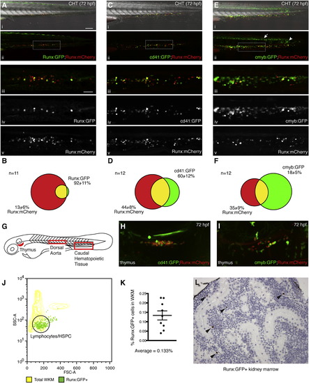 Characterization of Stable Runx:GFP and Runx:mCherry Transgenic Zebrafish Lines, Related to Figure 1 (A–F) Intercrosses of transgenic lines to show overlapping populations. Wide-field view of CHT at 72 hr postfertilization (hpf) with merged (i) GFP, mCherry and DIC channels, or (ii) GFP and mCherry. Detail in (ii) is shown below as (iii) merged GFP and mCherry, (iv) GFP, or (v) mCherry. Anterior left, posterior right, dorsal up, ventral down. Scale bars: (i-ii) 100 µm, (iii-v) 30 µm. (A) Overlap of Runx:GFP and Runx:mCherry lines. (B) Quantification of Runx:GFP and Runx:mCherry overlap. Runx:GFP overlaps 92 ± 11% with Runx:mCherry. Runx:mCherry overlaps 13 ± 6% with Runx:GFP. (CHT of n = 11 embryos scored). (C) Overlap of cd41:GFP and Runx:mCherry lines. (D) Quantification of cd41:GFP and Runx:mCherry overlap. cd41:GFP overlaps 60 ± 12% with Runx:mCherry. Runx:mCherry overlaps 44 ± 8% with cd41:GFP. (CHT of n = 12 embryos scored). cd41:gfp has known broader expression in thrombocyte progenitors at this stage (Bertrand et al., 2008 and Lin et al., 2005). (E) Overlap of cmyb:GFP and Runx:mCherry lines. (ii) Note the expression of the cmyb:GFP transgene in the ventral neural tube (arrow) and posterior notochord (arrowhead). (F) Quantification of cmyb:GFP and Runx:mCherry overlap. cmyb:GFP overlaps 18 ± 5% with Runx:mCherry. Runx:mCherry overlaps 35 ± 9% with cmyb:GFP. (CHT of n = 12 embryos scored). (G) Schematic of 60 hpf zebrafish embryo with location of thymus, dorsal aorta and caudal hematopoietic tissue (CHT). (H) Overlap of cd41:GFP and Runx:mCherry lines in the developing thymus. Note the bright circulating thrombocyte above. (I) Overlap of cmyb:GFP and Runx:mCherry lines in the developing thymus. (J) Forward scatter (FSC) and side scatter (SSC) were used to distinguish characteristic whole kidney marrow (WKM) populations (Traver et al., 2003). Runx:GFP+ cells were found predominately in the lymphoid/HSPC gate. (K) Flow cytometry of WKM from adult Runx:GFP transgenic zebrafish. Runx:GFP+ cells represent on average 0.133% of the total WKM. (L) Immunohistochemistry with anti-GFP antibody shows rare GFP+ cells in sections of Runx:GFP kidney marrow (brown; arrowheads; counterstained with hematoxilyn). Error bars show mean ± SEM. |