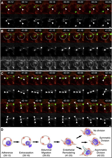Time-Lapse Live-Imaging Sequence of CHT Colonization, Related to Figure 3 and Movie S2 Selected frames of time-lapse are shown (1 frame/2 min). First row frames are a merge of Runx:GFP+ HSPCs (green; second row) and kdrl:RFP+ ECs (red; third row in B). Times are hours:minutes post fertilization. Scale bars: 10 µm. (A) HSPC (arrowhead) extravasates by squeezing through endothelial wall. (B) ECs remodel around HSPC to form niche (broken circle). (C) After HSPC division the daughter cells undergo a 90° rotation (arrowheads). The upper cell becomes migratory and crawls out of niche. (D) A diagram summarizing the steps of HSPC lodgement in the perivascular niche. The times shown correspond to the time-lapse frames shown above. Other possible cell division decisions are shown. |