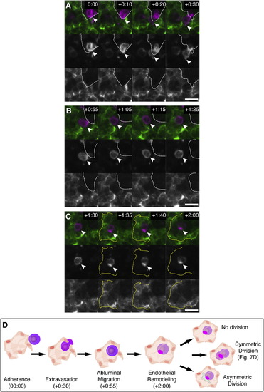 Time-Lapse Live Imaging of E11.5 FL Explant with Labeled HSPC and ECs, Related to Figure 4 (A) A time-lapse sequence from a FL lobe showing a c-kit+ HSPC (magenta) adhered to a CD31+ sinusoid (green). In ~30 min, the anterior of the cell protrudes (arrowhead) and extravasates to the abluminal side of the sinusoid (boundary marked by white dotted line). Luminal versus abluminal sides of the sinusoid were confirmed in single z slices of confocal stacks (data not shown). Times are hours:minutes after start of explant imaging. Scale bars: 10 µm. (B) After extravasation, the HSPC migrates on the abluminal side of the sinusoid. (C) ECs surround the HSPC as a rosette (yellow dotted line). (D) A diagram summarizing the steps of HSPC lodgement in the FL. The times shown correspond to the time-lapse frames shown above. A morphologically symmetric division is observed in Figure 4D. Other possible cell division decisions are shown. |