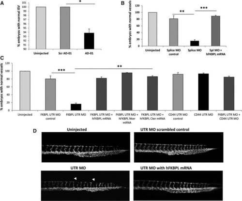 FK506-binding protein like (FKBPL) regulates vessel development in zebrafish embryos (A). Vessel quantification of 72 hpf embryos microinjected with AD-01 (1.3 pmol), demonstrating the inhibition of the intersegmental vessel (ISV) development. B and C, Graphs demonstrating a significant reduction in the number of embryos with normal vessels after injection of the Splice MO (B) and UTR MO (C), and significant phenotype rescue after coinjection of full length, N or C terminal hFKBPL mRNA in a Cd44-dependent manner. Embryos showing intact ISV formation at the indicated time points are defined as normal embryos in the quantification. Data points are mean±SEM. ne3. *P<0.05, **P<0.01, ***P<0.001 (1-way ANOVA, Tukey multiple comparison post tests). D, Photomicrographs of 48 hpf embryos injected with control MO/zfkbpl MO (UTR) showing the disrupted vasculature; arrows indicate the trunk and tail vessels, and this was rescued by expression of full length hFKBPL mRNA. All the images are lateral views, anterior toward left. PHENOTYPE: