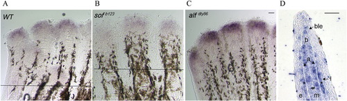 serpinh1b is differentially expressed in wild-type, sof b123 and alf dty86. Whole mount in situ hybridization shows increased expression in alf dty86 (C) and decreased expression in sof b123 (B) compared to wild-type (A). In situ hybridization on cryosection of a WT-5 dpa fin (D) reveals localization of serpinh1b in the blastema (b), basal layer of epidermis (ble) and skeletal precursor cells (*). Epidermis is denoted by ‘e’, mesenchyme by ‘m’, lepidotrichia by ‘l’ and actinotrichia by ‘a’. The amputation plane is indicated in panels A and B. The amputation plane is beyond the field of view in C. The scale bars in C and D are 50µm; the scale bar in C applies to the images in A, B, and C. |