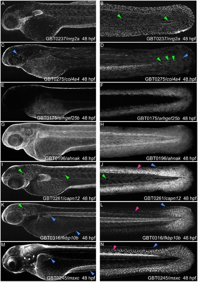 GBT protein trapping identifies integument loci with epidermal or fin mesenchymal expression. As identified by mRFP localization, seven GBT alleles have unique epidermal expression patterns emphasizing epidermal continuity over the body and larval fin folds. They are: (A, B) nrg2amn0237Gt, (C, D) col4a4mn0275Gt, (E, F) arhgef25bmn0175Gt, (G, H) ahnakmn0196Gt, (I, J) capn12mn0261Gt, (K, L) fkbp10bmn0316Gt, and (M, N) msxcmn0245Gt. (B, D, I, J, K) Four lines, nrg2amn0237Gt, col4a4mn0275Gt, capn12mn0261Gt, and fkbp10bmn0316Gt, have “holes” or “gaps” in their epidermal pattern (green arrowheads) where neuromasts embedded in the basal layer exclude the mRFP-positive basal keratinocytes. (A, G, I, K, M) nrg2amn0237Gt (A), ahnakmn0196Gt (G), capn12mn0261Gt (I), fkbp10bmn0316Gt (K), and msxcmn0245Gt (M) are also expressed in the pectoral fin folds. (C-D, J, L, M-N) col4a4mn0275Gt, capn12mn0261Gt, fkbp10bmn0316Gt, and msxcmn0245Gt epidermal expression (blue arrowheads) can be difficult to discern among other expression pattern components. (I-N) capn12mn0261Gt, megf6amn0316Gt, and msxcmn0245Gt also show expression in fin mesenchymal cells (pink arrowheads). (C, D, K, L, M, N) Several lines are also expressed in other tissues. (C, D) col4a4mn0275Gt appears in myotomes and the vascular plexus. (K, L) fkbp10bmn0316Gt is seen in the notochord. (M, N) msxcmn0245Gt is strongly expressed in the brain, spinal cord, and sensory maculae. hpf, hours post-fertilization. Comparisons of the mRFP localization patterns with the expression pattern of the endogenous genes are shown in Supporting Information (S1 Fig) EXPRESSION / LABELING: