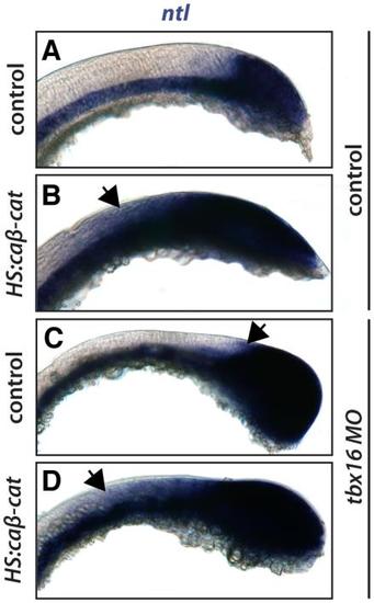Wnt signaling regulates ntl independently of tbx16. Expression of ntl is expanded in HS:caβ-catenin when compared to control embryos (A, B; 17 control and 15 transgenic); with tbx16 MO, ntl is similarly expanded in HS:caβ-catenin when compared to control embryos (C, D; 17 control and 26 transgenic).  |