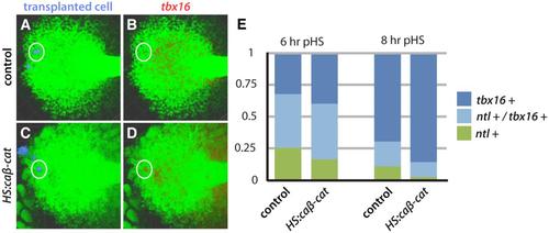 Transplanted HS:caβ-catenin cells activate tbx16 cell-autonomously. (A, C) Transplanted cells in the progenitor population are identified in blue. Cell-autonomous expression of tbx16 is not apparent in control cells (B) but is apparent in cells with HS:caβ-catenin (D). (E) Quantification of all transplanted cells within the tailbud from the same experiment as shown in A-D. At both 6 and 8 hrs post-heat shock, cells expressing caβ-catenin were less likely to express ntl and more likely to express tbx16 than control transplanted cells. At 6 hours post-heat shock, 151 cells were analyzed from 16 embryos (control) and 190 cells were scored from 19 embryos (HS:caβ-catenin); the distribution of control cells was different from HS:caβ-catenin cells (chi-square; P=0.052). At 8 hours post-heat shock, 131 cells were analyzed from 15 embryos (control) and 99 cells were scored from 14 embryos (HS:caβ-catenin); the distribution of control cells was significantly different from HS:caβ-catenin cells (chi-square; P<0.01).  |