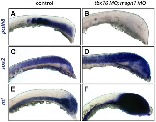 sox2 and ntl increase when Tbx16 and Msgn1 are depleted. Whole mount in situ hybridization shows a decrease in pcdh8 expression in embryos (A, B; 13 controls and 12 morphants) injected with tbx16 MO;msgn1 MO (B). sox2 expression (C, D; 11 controls and 13 morphants) and ntl expression (E, F; 16 controls and 10 morphants) increase in embryos injected with tbx16 MO;msgn1 MO (D, F).  |