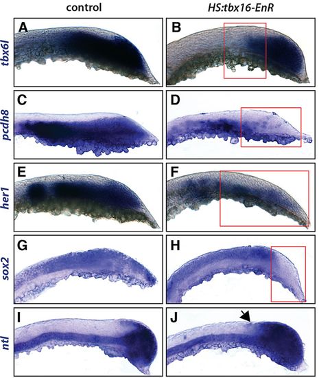 tbx16-EnR expression represses sox2 and activates ntl. In situ hybridization shows changes to gene expression with HS:tbx16-EnR (B,D,F,H,J) or in control (A,C,E,G,I) 4 h after heat shock. The red boxes (B,D,F,H) highlight the reduction of tbx6l, pcdh8, her1 and sox2 in the tailbud and the arrow (J) points to an expansion of ntl.  |