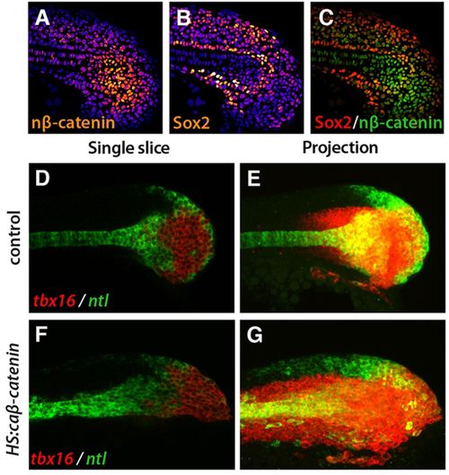 tbx16 is Wnt responsive. (A-C) Immunofluorescence shows cells in the tailbud with nuclear β-catenin (nβ-catenin; A, orange; cytoplasmic and membrane-bound β-catenin have been eliminated from the image; see Materials and Methods) or Sox2 protein (B, orange). DAPI labels nuclei (blue). The highest levels of nβ-catenin and Sox2 are white and the lowest levels are purple. (C) A composite image shows that there is little overlap between the Sox2 domain (red) and the nuclear β-catenin domain (green). (D-G) Fluorescent whole-mount in situ hybridization shows tbx16 (red) and ntl (green) with HS:caβ-catenin (F,G) and in control (D,E) at 4 h post-heat shock. Single slices (D,F) and maximum intensity projections (E,G) are shown. In all images, anterior is to the left and posterior is to the right.  |