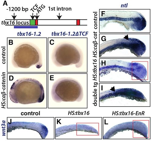 Wnt drives tbx16 reporter expression and tbx16 represses Wnt. (A) The zebrafish tbx16 locus, showing exons 1 and 2 (red) and a conserved region of the tbx16 promoter (green), which contains two predicted TCF binding sites (see supplementary material Fig. S5). The blue line marks the region used for the tbx16-1.2 construct. (B-E) Whole-mount in situ hybridization shows reporter expression from the tbx16-1.2 transgene with HS:caβ-catenin (D) and in control (B). Another reporter line with mutations in both of the predicted TCF sites (tbx16-1.2ΔTCF) showed no expression with (E) or without (C) HS:caβ-catenin. (F-I) In situ hybridization shows wild-type ntl expression (F; n=22 embryos) and the changes in ntl expression after heat shock induction of HS:caβ-catenin (G; n=16 embryos), HS:tbx16 (H; n=11 embryos), and both transgenes (I; n=9 embryos). The arrows (G,I) highlight the expansion of ntl and the red box (H) highlights the reduction of ntl. (J-L) In situ hybridization shows wild-type wnt3a expression (J) and the loss of wnt3a expression after heat shock induction of HS:tbx16 (K) or HS:tbx16-EnR (L). Red boxes (K,L) highlight the reduction of wnt3a in the tailbud.  |