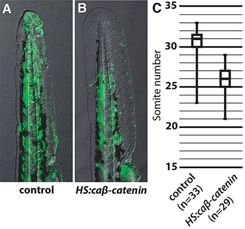 caβ-catenin expression causes early exit of cells from the progenitor zone. (A,B) Overlays of transplanted cells labeled with fluorescent dextran (green) onto a bright-field image from control (A) or HS:caβ-catenin (B) donor embryos into wild-type hosts. (C) Quantification of the most posterior somite occupied by a fluorescently labeled cell in host embryos. Data are significantly different (Mann-Whitney U-test, P<0.05).  |