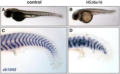 Ubiquitous tbx16 expression causes organism-wide defects. At 36 hpf, bright field images show that control siblings (A) are longer than embryos with the HS:tbx16 transgene (B) after heat shock. In situ hybridization with cb1045, a probe that normally marks the somite boundaries in control siblings (C), shows severe disruptions in somite formation in HS:tbx16 embryo (D). The left-most somite shown in C is the 14th somite and the left-most somite shown in D is the 13th somite. All embryos were heat shocked at the 12 ss.  |