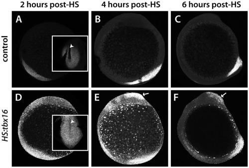 Ectopic Tbx16 is ubiquitous, labile and peaks at 4 hours post-heat shock. In control (A-C) and HS:tbx16 (D-F) embryos, immunofluorescence shows that Tbx16 protein levels have increased by 2 hours post-heat shock (A, D) with a peak at 4 hours post-heat shock (B, E), and that levels of Tbx16 have largely returned to normal by 6 hours post-heat shock (C, F). Inset in D shows ectopic Tbx16 in the notochord and neural tube (marked by arrowheads) when compared to the control inset in A (both dorsal views of the tailbud); arrows in E, F highlight the telencephalon, which retains ectopic Tbx16.  |