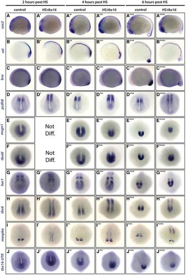 Gene expression after heat shock activation of HS:tbx16. Whole mount in situ hybridization data used for the summary of changes to genes after the expression of ectopic tbx16 (shown in Figure 2A). Because of the large number of embryos screened for this analysis, transgenic embryos were not separated from their nontransgenic siblings prior to in situ hybridization. A minimum of 30 embryos was used for each condition. In all cases except where noted as Not Diff. (not different), approximately 50% of the embryos matched previously published wild-type expression patterns and 50% showed the altered pattern. See Table S1 for quantification of the results.  |