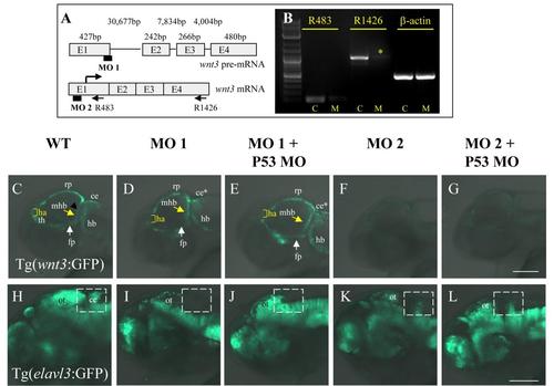 Interference with Wnt3 function disrupts cerebellar differentiation. (A) Organization of the wnt3 pre-mRNA and regions targeted by wnt3 MOs, MO 1 (targets wnt3 exon1-intron 1 boundary) and MO 2 (targets wnt3 5′UTR). The length of each exon and intervening intron is indicated. (B) RT-PCR analysis of wnt3 in wild type and morphants (MO1) at 30 hpf. Wnt3 knockdown upon microinjection of MO1 interfere with formation of wild type wnt3 transcripts highlighted by (*). Abbreviation: control (C); MO1 injected morphants (M). (C-G) Only microinjection of translation blocking MO (MO2) whose recognition site is present in the wnt3 regulatory element successfully interferes with GFP expression in Tg(wnt3:EGFP)F1. (H-L) Wnt3 deficiency through either microinjection of MO1 or MO2 with or without p53 MO consistently reduces GFP-positive neurons in the cerebellum (ce) of 72hpf Tg(elav:GFP) embryos. Insert scale bar is 50 µm.  |